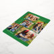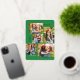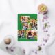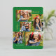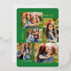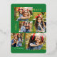 This stylish five photo collage Christmas card features modern typography reading, PEACE, JOY, and LOVE in real gold foil over a bright green background (the colour can be customised to any colour you'd like). The back of the card contains a matching faux foil Christmas trees pattern over a custom colour background (shown in white).