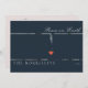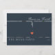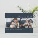 A modern midnight blue holiday card features 2 photos in front, 1 photo in the back of the card with decorative red heart in between. Script "peace on earth". Text field to customise your personal message.