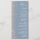 The left-hand edge of this elegant modern wedding menu features a peach faux glitter design. The customisable text combines white handwriting, copperplate and italic fonts on a dusty blue background. The reverse side features a matching dusty blue and peach glitter design.