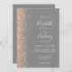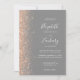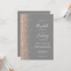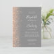 The left-hand edge of this elegant modern wedding invitation features a peach faux glitter design. The customisable text combines white handwriting, copperplate and italic fonts on a grey background. The reverse side provides space for wedding details on a solid grey background, along with a QR code guests can scan to visit your website and RSVP, which saves the cost of printing and mailing separate RSVP cards.
