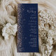 The left-hand edge of this elegant modern wedding program features a peach faux glitter design. The customisable text combines peach handwriting, copperplate and italic fonts on a navy blue background.