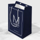 This gift bag features personalised groomsman's monogram and name with title and wedding date in white modern sans serif font style on navy blue background.