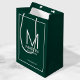 This gift bag features personalised groomsman's monogram and name with title and wedding date in white modern sans serif font style on emerald green background.