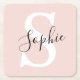 Modern Personalised Name Monogram Pastel Pink Square Paper Coaster