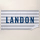 Personalised beach towel design features custom text in simple and modern all caps lettering that can be personalised with a first name. Navy blue text contrasts a striped light cool grey and white background with a stylish pattern of horizontal stripes. Colours and font style can be completely customised.