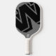 A pickleball-paddle personalised with his name and surname in different colours (sans serif font), over a grey background with a big oversized black initial letter... a modern monogram design, with the name of the stylish player.