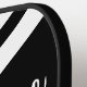 Modern personalized custom color pickleball paddle featuring a name (or monogram) shown in an editable hand-lettered script typography and changable white sporty stripes against an editable black background so you can create a custom design for the pickler or pickleball enthusiast. COLOR CHANGES: Change the text, stripe and/or background colors or add a styled graphics background by clicking on the EDIT tab in the PERSONALIZE section. PADDLE OPTIONS: Choose from Black, Tan or White edging and grip colors on the ordering page. ASSISTANCE: For help with design modification or personalization, color change, resizing, transferring the design to another product or if you would like coordinating items, contact the designer BEFORE ORDERING via the Zazzle Chat MESSAGE tab below or email makeitaboutyoustore@gmail.com.
