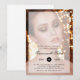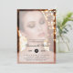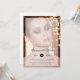 Modern photo grand opening invitation featuring a picture of a beautiful woman with a sheer overlay and your event details in black text. Keep the sample photo or replace it with one of your own. Your business name is in an elegant script font and the date is in a black circle. A chic and stylish design that is perfect for a grand opening of a beauty or hair salon.