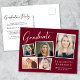 Modern burgundy red graduation party invitation postcard featuring a 5 photo collage of scattered pictures in white frames, "Graduate" in a chic white script, the grad's name in elegant typography and their school and class year in simple typography. Add your party details on the back.