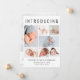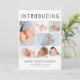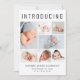 An elegant birth announcement to introduce your newborn baby to friends and family featuring "Introducing" across the top in large lettering, a 7 photo collage and their name, birth date and birth stats in simple modern typography. On the back, add another photo and your personalised message.