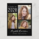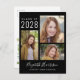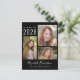 Modern black graduation announcement postcard for her with a 3 picture photo collage on the front. Add her name in a stylish trendy white script and her class year and school or university in white typography. On the reverse, add an additional photo and a custom message.
