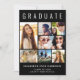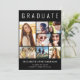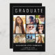 Modern black graduation announcement and party invitation featuring "GRADUATE" in large white letters, a seven photo collage of the graduate and their name, class year and school in simple white typography. Add the grad party details on the back.
