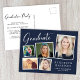 Modern dark blue graduation party invitation postcard featuring a five photo collage of scattered pictures in white frames, "Graduate" in a stylish white script, the grad's name in elegant white typography and their school and class year in simple white typography. Add your party details on the back.