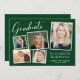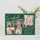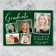 Modern green graduation announcement featuring a collage of five scattered photos in white frames, "Graduate" in a stylish white script, the grad's name in elegant white typography and their school and class year in simple white typography.