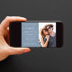 Modern dusty blue wedding save the date announcement featuring your photo and "Happily Ever After" in a mix of simple white typography and a chic white script. Personalise your save the date details and add your names in a signature-like script. On the back, your names and wedding date are joined together by a heart.