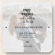 Trendy white transparent overlay black script free drinks and a wedding on the side open bar wedding save the date personalized plastic drink coaster.