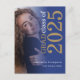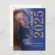Modern Grad photo Gold Blue 2025 Graduation. A stylish typography rotated sideways with your photo behind a graduated tinted layer to announce the happy news of your high school senior class graduate on a handy postcard, with text in white and gold aligned to the right. Easily personalise the year, graduate name and high school and replace the sample photo with your own.