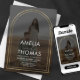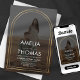 The invitation uses a neutral charcoal grey background, providing a sophisticated backdrop for the golden arch and the couple's photo. The names are displayed in a clean, modern font, adding a touch of elegance to the overall design.