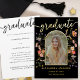 Celebrate your graduate daughter’s college graduation with a stylish and heartfelt graduation announcement party invitation to her graduation party! This Modern gold foil Script Calligraphy Graduation Party Invitation is designed to capture the excitement and joy of this special milestone. Featuring elegant gold calligraphy and a whimsical watercolor wildflower arch on a modern trendy white background this invitation exudes stylish charm, and celebration. The front highlights your daughter’s name and party details in beautiful gold script typography on a black background, while the back includes additional event information in gold modern typography.