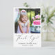 Modern thank you card for her birthday party featuring her photo and "Thank You" in an elegant contemporary script with a heart swash. Personalise with her first name and the event date in simple typography. On theback, add an additional photo, her customised thank you message and her name in a signature-like script.