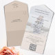 This design features a modern photo budget QR code wedding invitation with a vellum overlay couple picture, calligraphy script ampersand, transparent clear picture overlay, RSVP via website online URL, an elegant seal and send invitation, calligraphy trifold budget set, an elegantly simplistic blush pale neutral, blush minimalist minimal, couple bride and groom photo