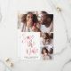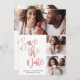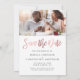 Modern wedding save the date announcement card featuring a collage of your favorite photos (3 on the front, 1 on the back), "Save the Date" written in a stylish rose gold faux foil script and your names, wedding date, venue and website in simple, minimal typography.
