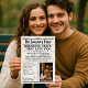 Celebrate your love story with this modern, minimalist wedding invitation designed to look like a vintage newspaper, complete with a romantic “Our Story” section and space for your favourite engagement photo.