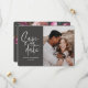 Modern photographic floral wedding save the date. In purples, pinks, browns and green. Modern take on rustic wedding with script handwriting.