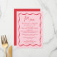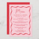 Add a vintage touch to your engagement party, rehearsal dinner, or wedding reception with this Modern Pink and Red Wavy Frame wedding menu. The design displays the couple's names, wedding date, and menu options in bold red lettering surrounded by a red wavy frame border against a pink background. The retro wedding menu coordinates with our Modern Wavy Frame wedding collection.