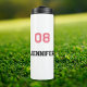 Create your own custom, personalised, cool, chic, trendy, classy, modern, stylish pink and black typography / font / script, 16 oz., sleek cylindrical shape, vacuum-sealed double-walled construction, glossy white finish, stainless steel monogrammed player name jersey number thermal tumbler that keeps your warm beverages warm and your cool beverages cool, all while keeping your hands comfortable. Simply type in your name / kids name / player name and player jersey number, to customise. Perfect for your favourite hot & cold beverages, health drinks, shakes, tea, coffee, soup etc and for gym, sports field, hiking, camping, trekking, school, college, home, office. Makes a great gift for wedding, birthday, graduation, fathers day, mothers day, christmas, holidays, marriage anniversary, valentines day, back to school, and more, for your loved ones, kids, girlfriend, boyfriend, mum, dad, son, daughter, brother, sister, husband, wife, grandparents, teams, club, teammates, athletes, player, coach, sportsmen, friends and family.