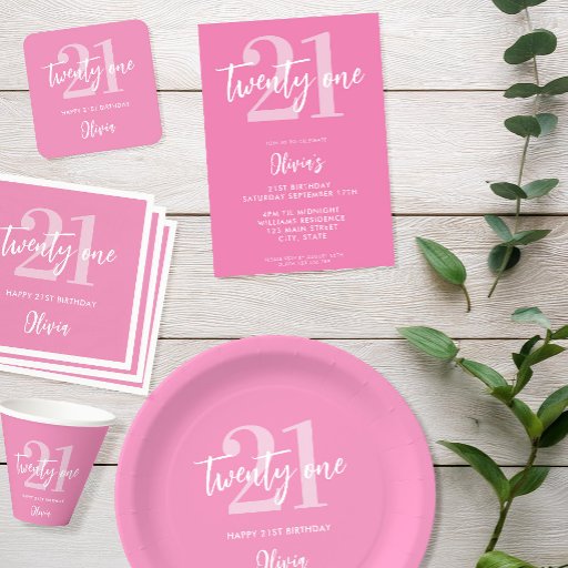 A simple modern 21st birthday party coasters featuring elegant calligraphy script typography and minimalist design in pink and white colour.