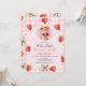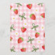 Girls berry first birthday invitation template for girl featuring various strawberries, white daisies and green bow on a pink gingham pattern background and pink arch. This berry first birthday invitation features a photo on the front and is ideal for a girls strawberry themed first birthday party.