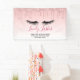 A business banner with a modern, trendy design. For those wish to convey an air of class and elegance. Designed with a background which has an image of sparkling, pink glitter drips. The rest of the background is a delicate pastel pink colour gradient. An illustration of a pair of black eyelashes complete the design.