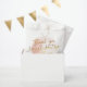 Design features a modern calligraphy script Thank You For Celebrating With Us over a pink and gold splattered watercolor shape. Easily customise names and special event date. An ideal compliment to your modern wedding, bridal party favour gifts, and more.