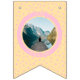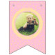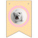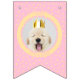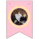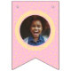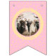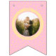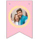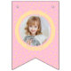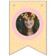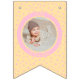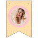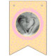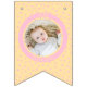 Replace the photos with your own for a fun party decoration and add your name and message. We have written "it's a girl" in a modern minimalist typography. It features soft boho colors of pastel yellow and pink and cute bohemian polka dots. It is also the perfect bunting for a nursery or a new baby party bunting flags.
