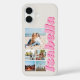 Create your own personalised photo collage iPhone case featuring 5 of your favourite pictures in simple grid design alongside custom monogram name in modern pink typography.