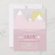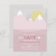 A modern baby shower invitation featuring an illustration of snow capped pink mountains and a yellow sun.