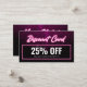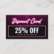 This elegant discount card is designed to impress your clients and boost your business. The dark background with a subtle geometric pattern provides a sophisticated backdrop for the bright pink neon text, making your offer stand out. The simple yet stylish design is versatile enough to suit various hair salon brands. Personalise it with your contact information and special offer to create a memorable and effective marketing tool for your hair styling services. Attract new clients and reward your loyal customers with this discount card.