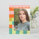 Announce the graduation of your daughter with this trendy color blocks graduation announcement card personalized with two photos of your daughter, one on each side. The background has modern color blocks and stripes in soft pink, strong orange, teal, and chartreuse.