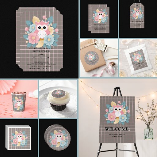Stylish pink owl baby shower invitation featuring a unique black and pink grid background with soft pastel floral accents. A perfect blend of modern and whimsical for girl or gender-neutral baby showers. If you need any other matching product or customisation, kindly message via Zazzle.