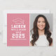 Announce your high school or college graduate in style with this graduation announcement and party invitation. Two-sided card features a senior portrait of the graduate with grad cap and simple and modern white typography design. The pink background can be changed to a different colour with the "Customise It" feature, then Edit / Background to select another colour.
