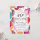 Invite your 40th birthday party guests in style with this modern flat card invitation featuring a background of balloons with colourful fractal patterns in pink, red, purple and gold. Your party details to personalise are in black typography on a white opaque overlay. The back of the card has a pattern of colourful balloons on white. Designed by ©Tim Coffey and Susan Coffey.