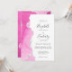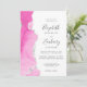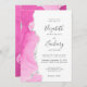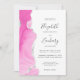 The left-hand edge of this elegant modern wedding invitation features a pink watercolor agate border trimmed with faux silver foil. The customisable text combines handwriting, copperplate and italic fonts in charcoal grey on a white background. The reverse side features a matching pink and silver agate design.