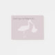 A pale pink post it note featuring a stork carrying a new baby bundle with space for your name and baby's too