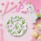 The product design features a pattern of pink tulip flowers. This botanical illustration makes modern chic and unique paper plates for her birthday, Easter, Mother's Day, or wedding party.