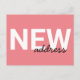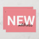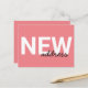 A fun minimalist style moving announcement postcard done in a cool modern bold white block and black script overlapping font typography on a pink card that says: New address on the front and has a template on the back for your new address with a fun quip that you can keep or customise to fit your need. #relocating