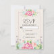 An RSVP card with a pretty watercolor design. Pink flowers arranged in a beautiful bouquet.
