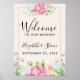 Wedding welcome poster with a pretty watercolor design. Pink flowers arranged in a beautiful bouquet. Cream colored background.