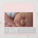 Modern pink, white stripes grey Christmas holiday elegant and stylish flat photo card featuring light pink and white stripes, a grey band with your text “Joy Peace and Love” with a snowflake in place of the letter "O" in the word joy, your names and two hanging white Christmas ornaments or balls .
