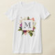 A t-shirt with a pretty design. A floral arrangement of many different varieties of flowers in red, pink and white colours, and lots of leafy green foliage. A frame layered over top with a faux-gold-foil border. Classy and elegant design. Personalise with a letter.